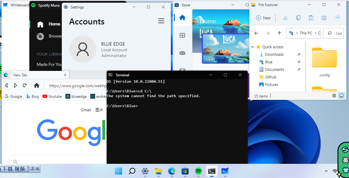 我可以找到的可以打开的窗口有:白板、Spotify、设置、商店、资源管理器、套了一层 iframe 的 Edge 浏览器、终端