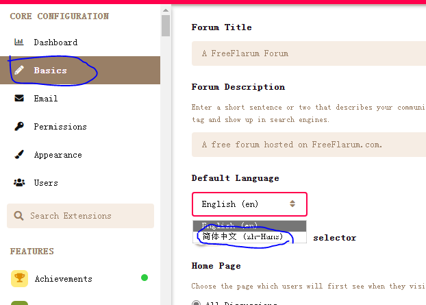选择默认语言,然后划到下方 save changes (想要国际化一点也可以把选择语言打开)