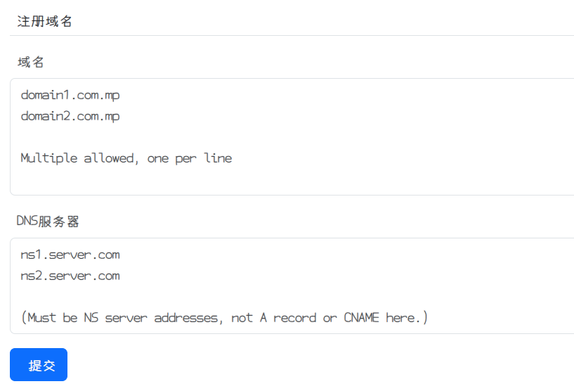 第一个输入域名,第二个输入 DNS 服务器 (均为一行一个)