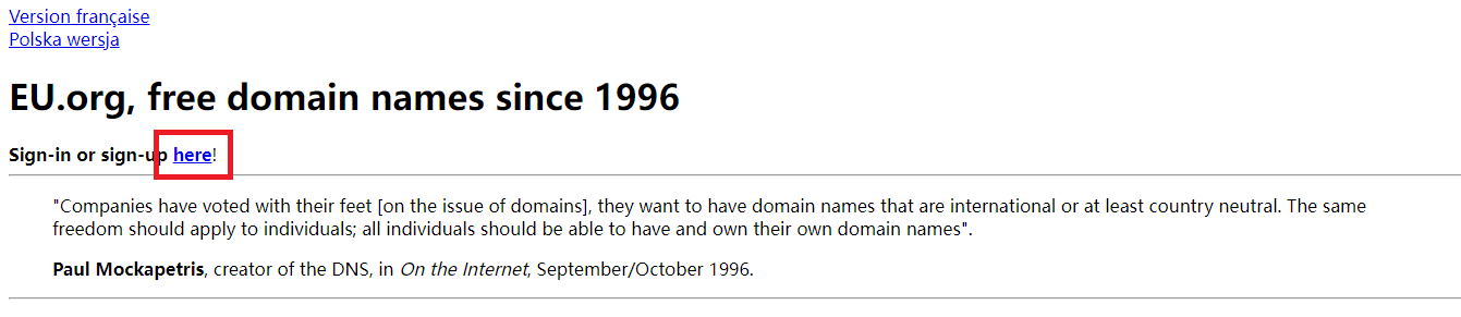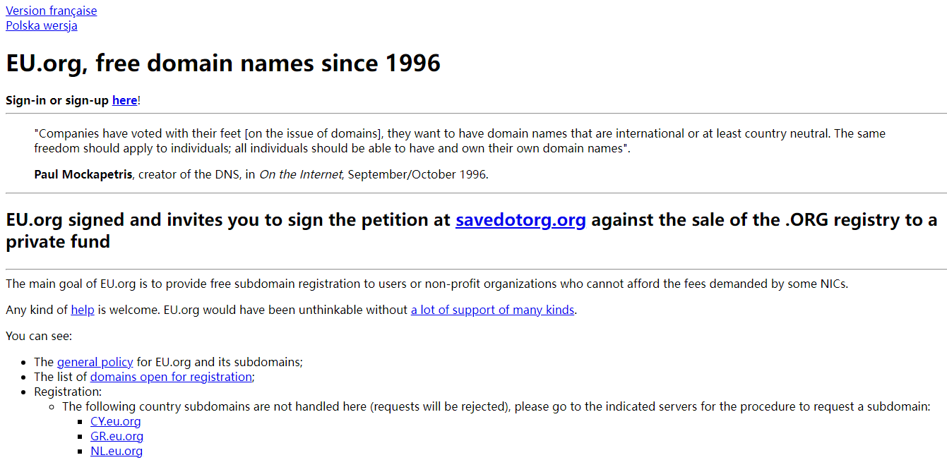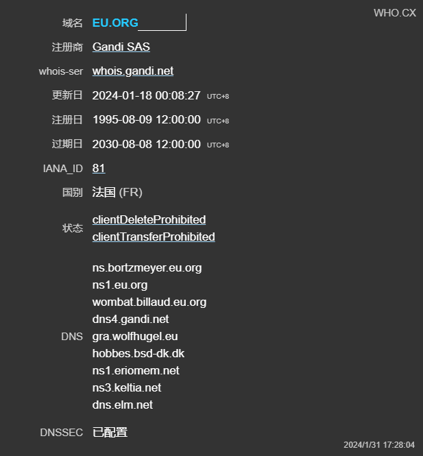 从查询出的 WHOIS 信息中可得知 eu.org 在1995年8月9号就被注册了