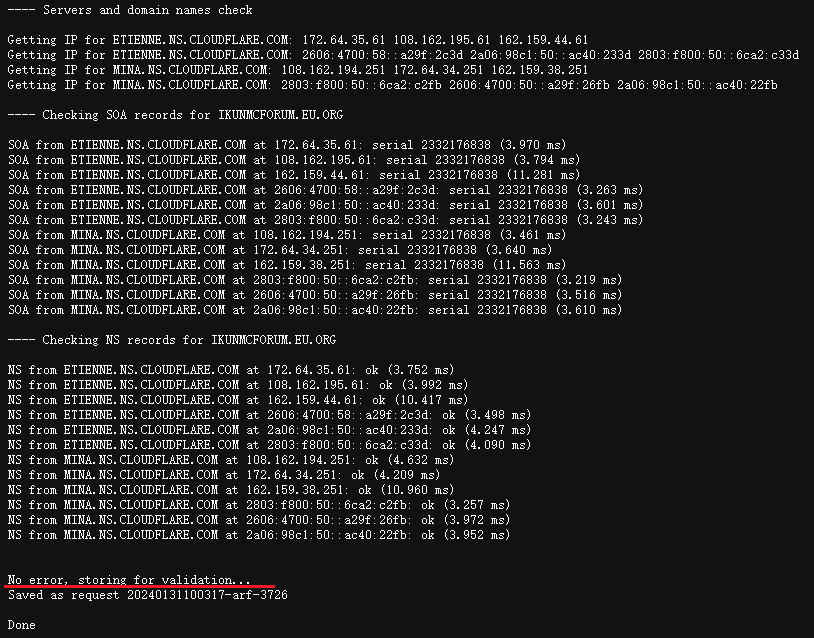 当提示 No error, storing for validation... 时,代表申请成功,接下来就是等待通过